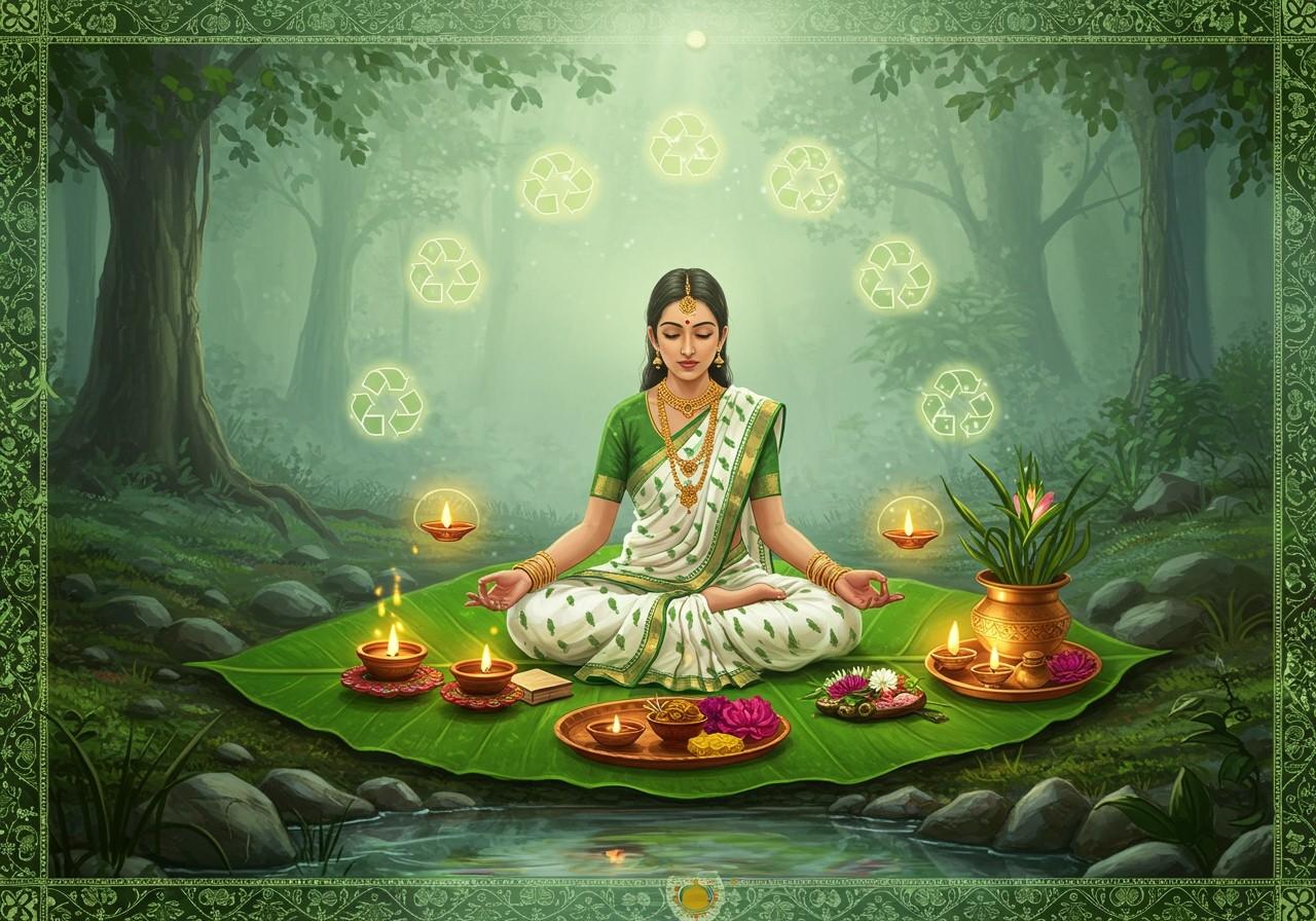 A serene depiction of nature and spirituality intertwined, representing Navayana's environmental ethos.