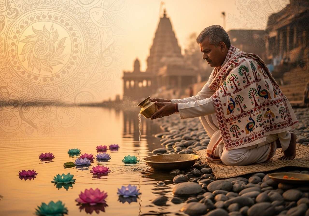 Tarpan is the act of satisfying the ancestors with water. It involves offering water mixed with black sesame seeds (Til), barley, and Kusha grass. Standing facing the South—the direction associated with the ancestors—one pours this sacred water slowly through the fingers while chanting mantras. This simple yet powerful act is believed to reach the ancestors directly, cooling their souls.