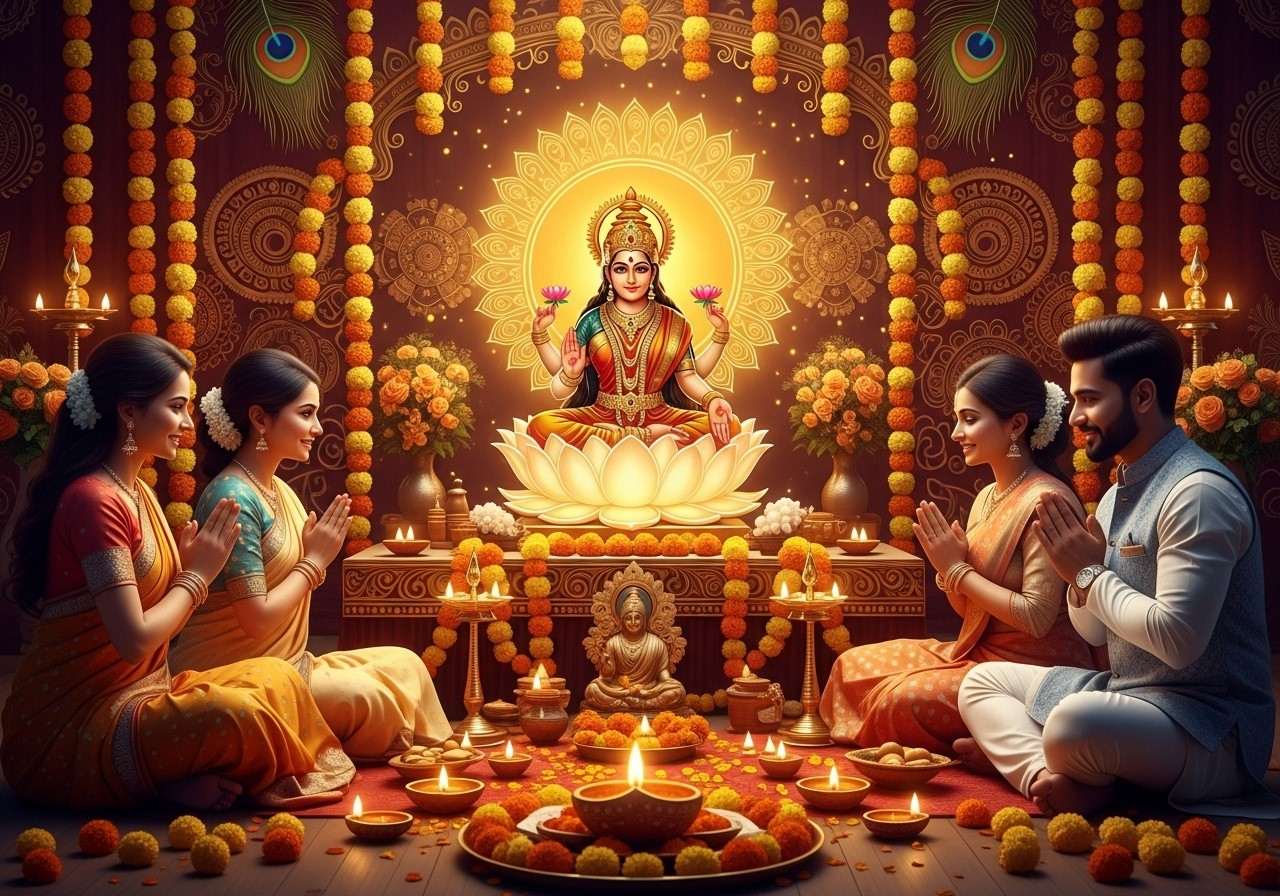 • Presenting the Heartfelt Sacred Offerings: With a heart overflowing with pure devotion and profound gratitude, lovingly offer freshly plucked, fragrant flowers, carefully prepared traditional sweets, and your deepest, most sincere prayers directly to the revered deities. This selfless act of giving is a beautiful, deeply personal expression of gratitude and pure love, establishing a profound spiritual connection with the powerful divine forces of eternal prosperity.