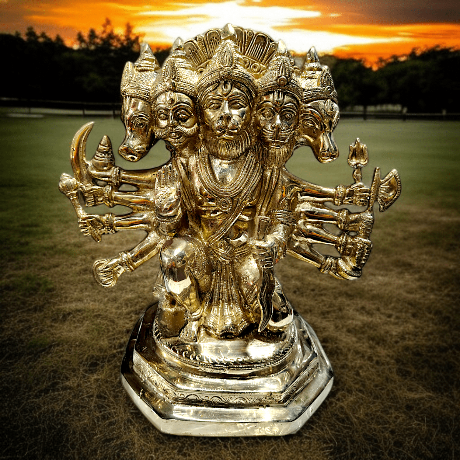 Crafted with meticulous detail from high-quality pure brass (pittal), this 13″ holy idol radiates a golden aura, capturing the divine radiance of Panchmukhi Hanuman. The skilled artisans have poured their devotion and expertise into every intricate detail, creating a truly breathtaking piece of art. This Pure Brass Panchmukhi Hanuman – Panchamukhi Hanuman ji Antique Idol – The God of strength & prosperity is not just an idol; it’s a testament to the rich artistic heritage of India.