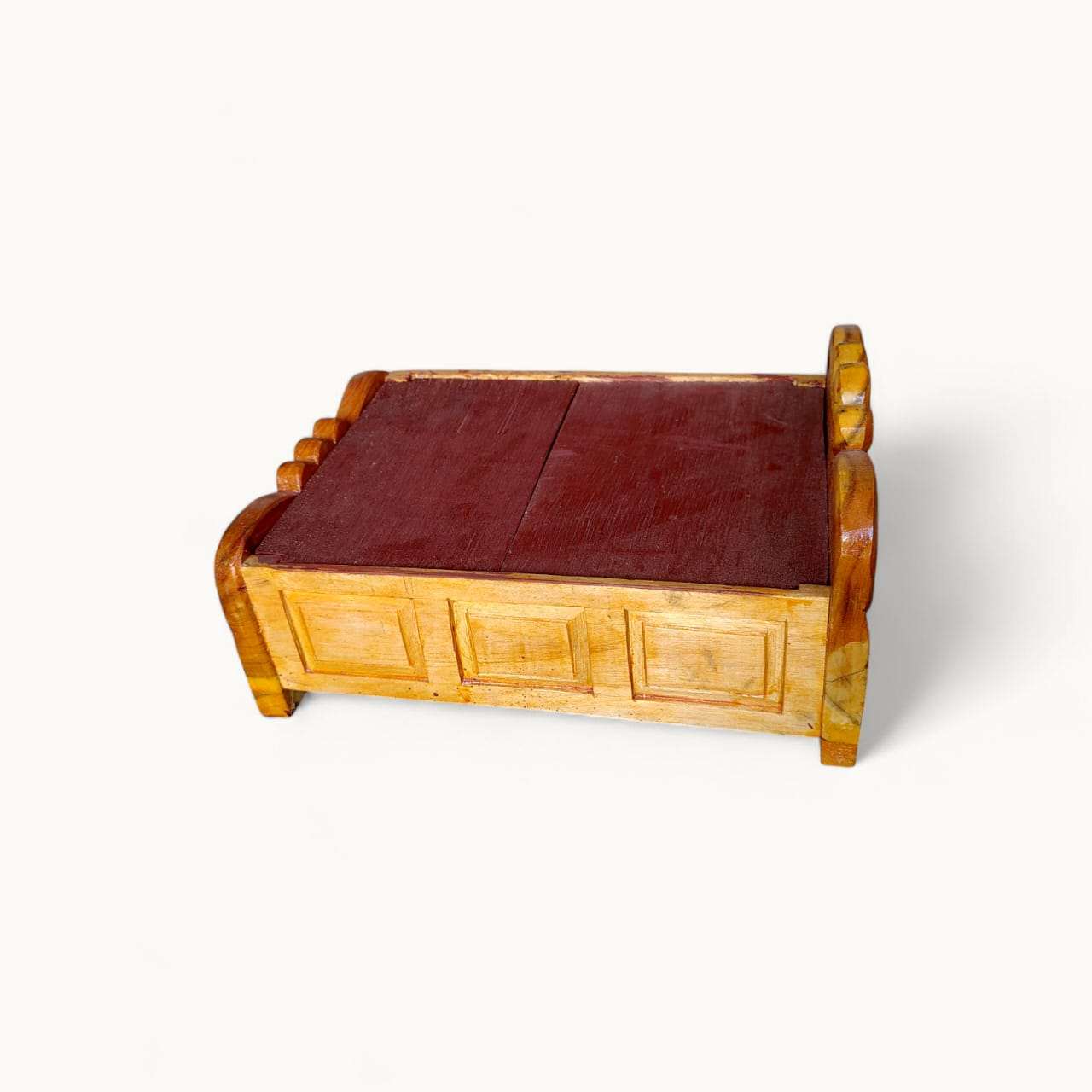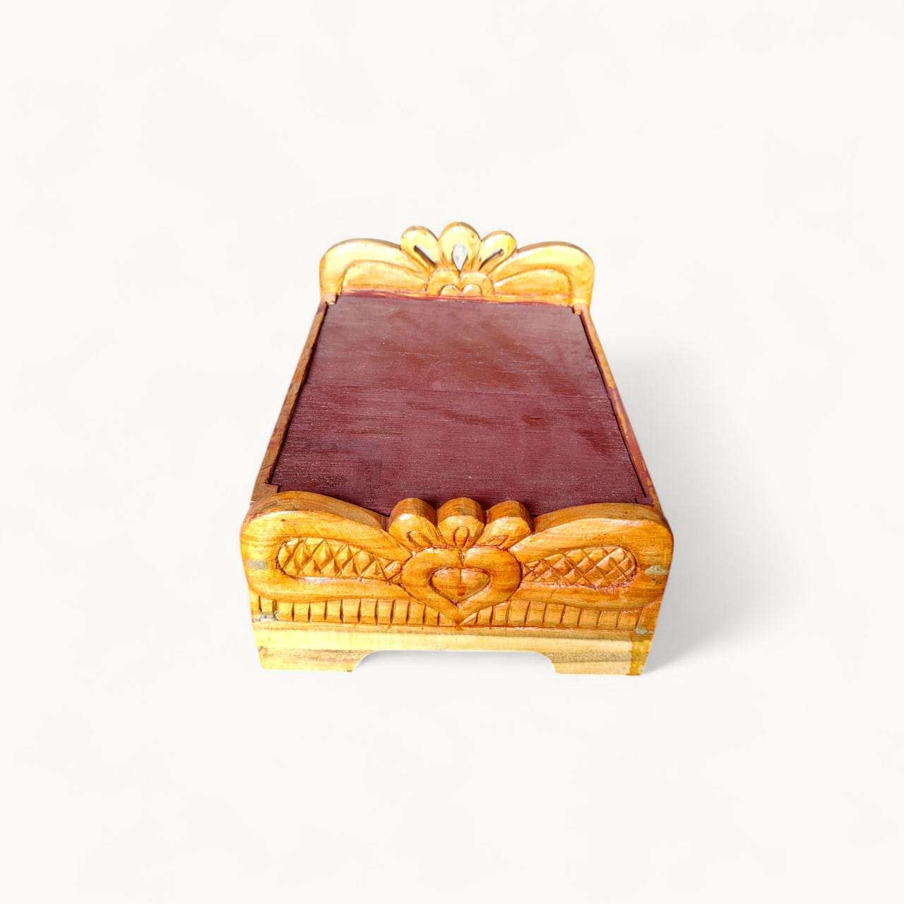 Imagine your little Kanha resting peacefully on this beautiful wooden bed after a long day of play and blessings. Lovingly crafted from high-quality wood, this bed provides a comfortable and sacred space for your deity. But its true magic lies within! This innovative Wooden Box Bed For Laddu Gopal features a spacious, concealed storage compartment. Say goodbye to cluttered pooja spaces! Now you can neatly organize and store all of your Bhagwan Ji’s precious belongings – from their elegant Poshak (dresses) and dazzling Shringar (jewelry) to tiny blankets and divine accessories – all in one sacred, easily accessible place right beneath them.